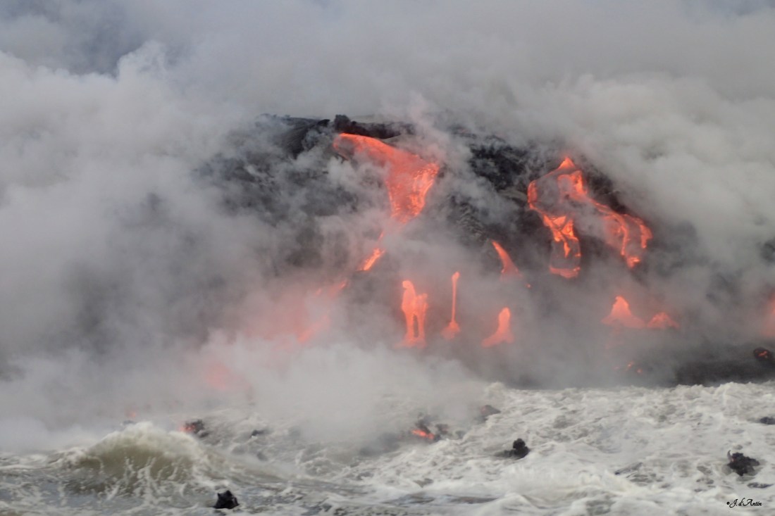 A savoir: l’avant du bateau se fait complètement arroser. Si c’est n’est pas votre truc, asseyez-vous plutôt au milieu, vous aurez une bonne vue de la lave peu importe votre siège. Le trajet dure environ 45 minutes et vous allez être vraiment proche de la lave. Quand je dis vraiment proche, je veux dire que vous allez avoir la sensation d’être dans un sauna! Le bateau reste environ 30 minutes ce qui donne amplement l’occasion de prendre beaucoup de photos comme celle-ci.